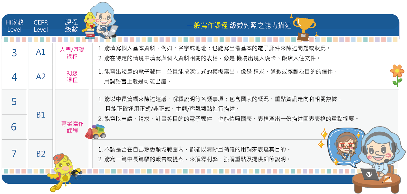 Level 5~7:大學生或有培養進階寫作能力需求的人士。