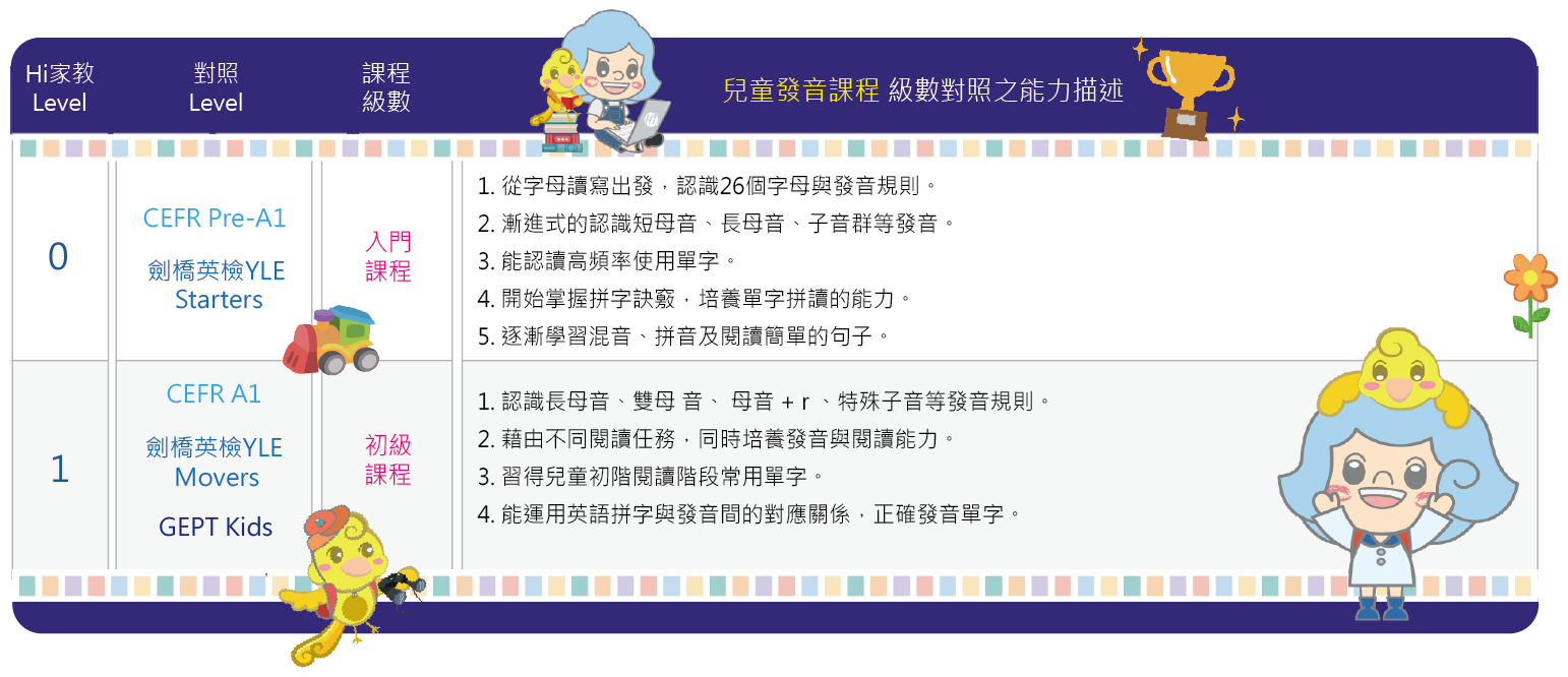 「Hi家教兒童發音課程」針對零基礎孩童所設計,透過字母認識、音素認知、自然發音教學、發音規則說明、高頻率用字認讀,逐漸建立發音基礎,建立閱讀能力,增強字彙量,並強化聽力,奠定孩子在英文起步學習的發音穩固基礎。