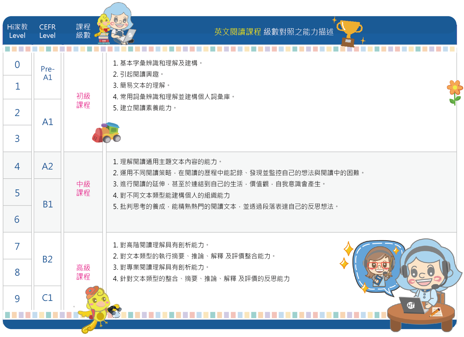 依美國Metametircs, Inc.教育公司的Lexile分級體系衡量讀者閱讀水平,並結合GEFR的閱讀內容難易,標識教材程度分級。